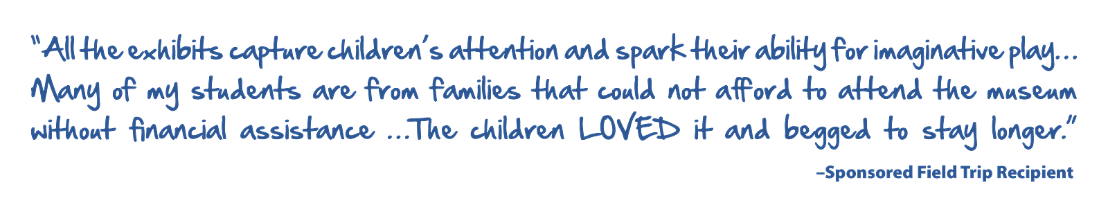 We believe that all children deserve respect and the opportunity to learn. Join us in igniting sparks of curiosity and creating moments of magic for every child. Our suite of 30 Access programs provides free and reduced-fee admission to more than 100,000 visitors each year. Donors like you help make that possible!