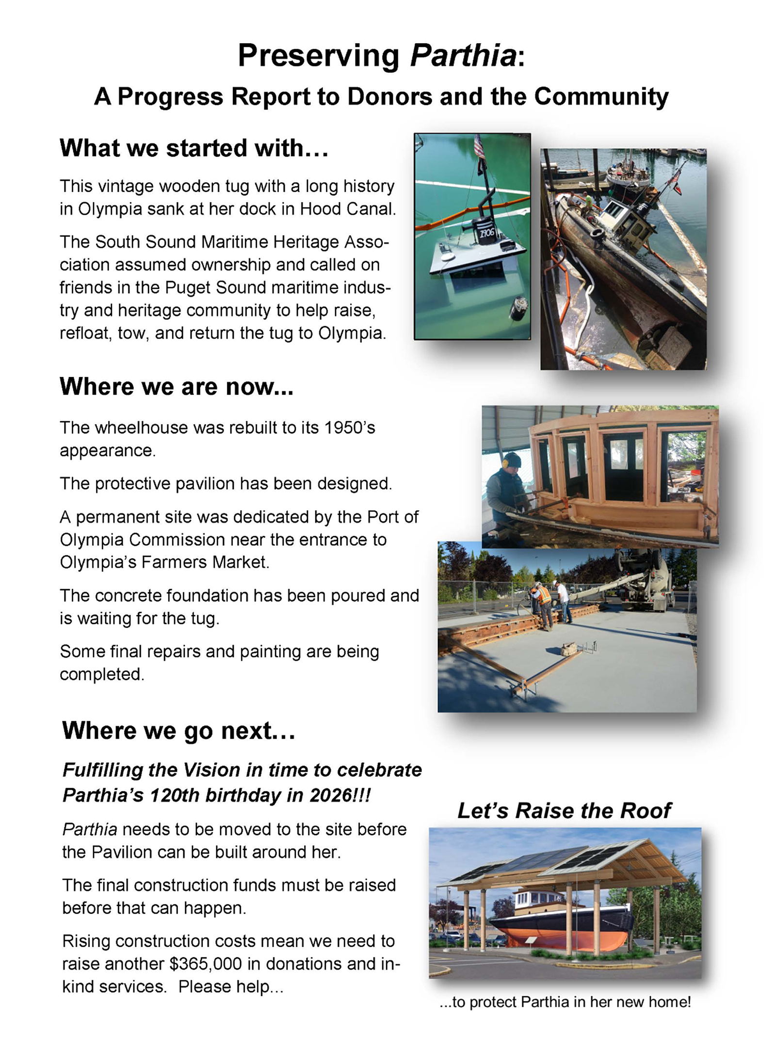 After the accidental sinking of the historic tugboat Parthia in 2017, the SSMHA and several dedicated businesses and individuals came together to rescue, salvage and restore this icon of the Olympia working waterfront and Harbor Days. She worked in our local Budd Inlet harbor for across four decades, from the 1930’s through the 1960’s, for Delta V. Smyth Tugs and Barges and the Foss Launch and Tug Company. Later owners brought her back to Olympia 26 times to participate in Harbor Days festivals, where she often won her tugboat race class. In the best interest of preserving her for future generations, it was decided she should rest on land where our community and visitors alike can enjoy her year-round. Of course, the pandemic delayed our efforts, but we are now making a major push to complete the project funding in the next few months. We hope to finish the construction soon so we can all celebrate Parthia’s 120th birthday in 2026.