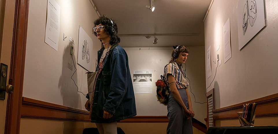 Community members engage with an audio exhibit at the Capitol Theater as part of the InhaleExhale event, Feb 2020.