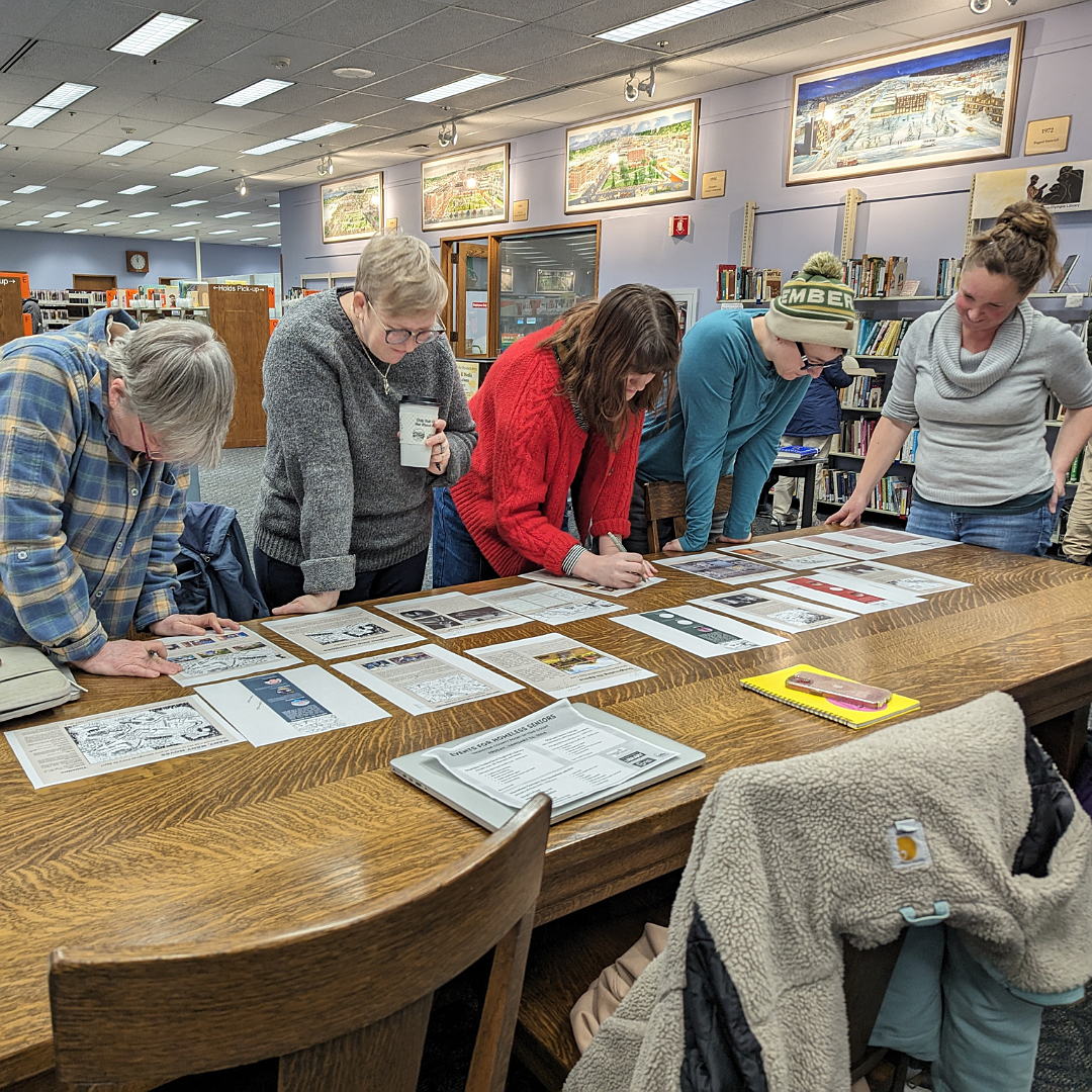 2023-24 Community Roots cohort proofread exhibit panels before printing.