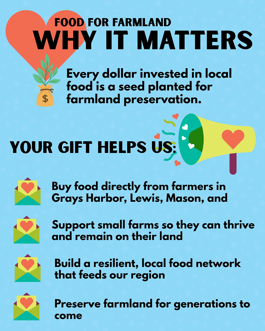 By buying food now, we’re not just purchasing ingredients for next year’s dinner — we’re giving farmers assurance that their future produce will be purchased, allowing them to plan, invest, and grow with confidence. This ensures South Sound farmland remains productive and supports the livelihoods of farmers for years to come.Organization name